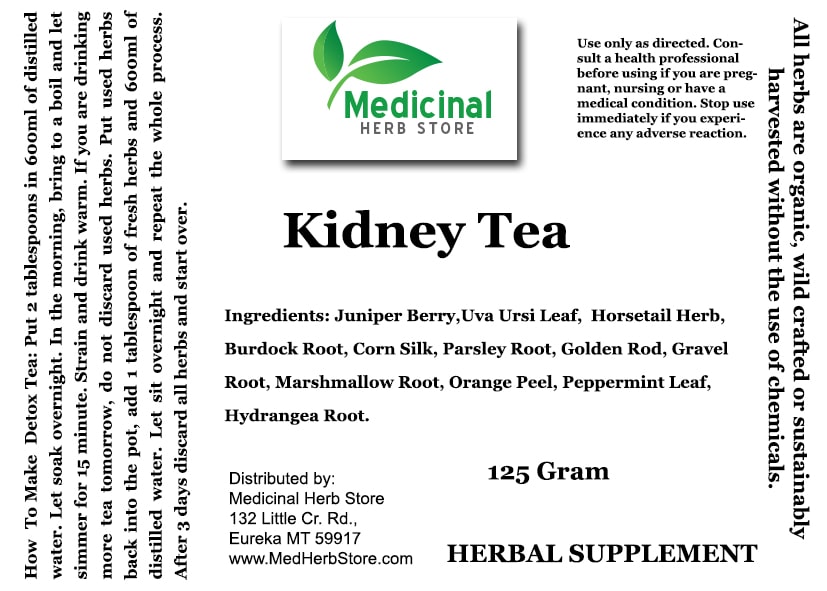Ingredients: Organic or wild-crafted Juniper Berry, Corn Silk, Uva Ursi Leaf, Parsley Root, Horsetail Herb, Goldenrod Herb, Hydrangea Root, Gravel Root, Marshmallow Root, Orange Peel, Peppermint Leaf